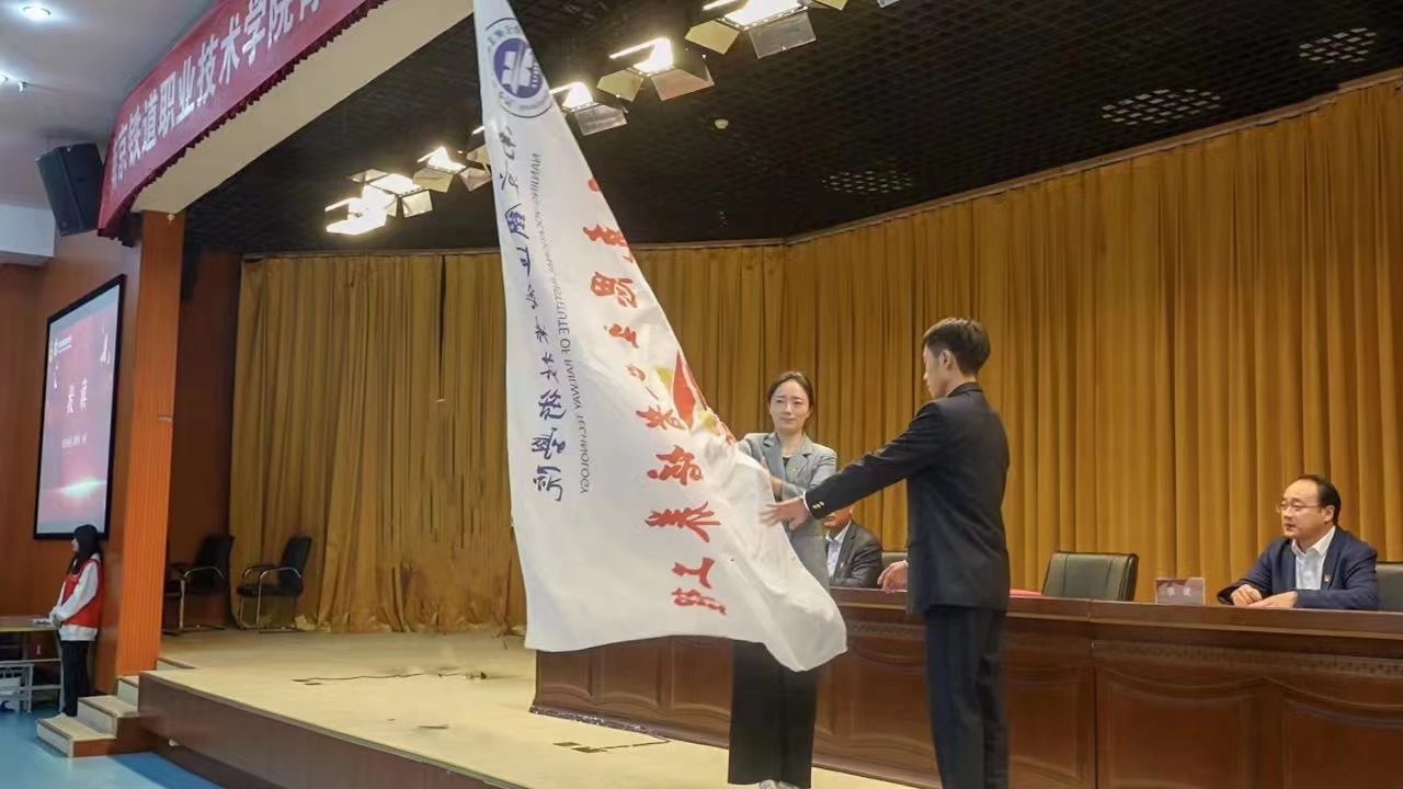 校党委委员、副校长赵婧为我校“青马工程”第二十六期培训班授旗。
